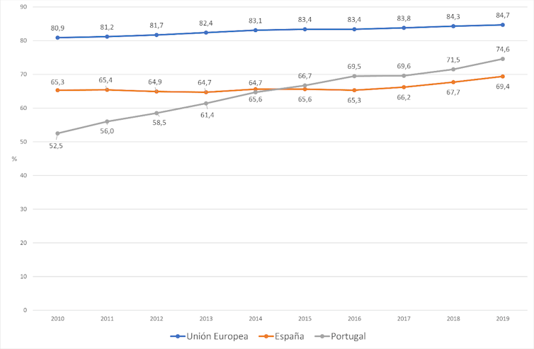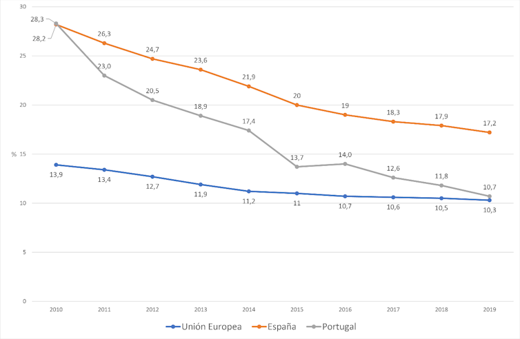 Resulta de especial interés detenernos en la evolución de la tasa de abandono educativo temprano cuyo objetivo 2020 se fijó para España hace una década en el 15 %, frente al 10 % del conjunto de la Unión Europea. Portugal, al final de este año, habrá logrado el nivel más exigente y España no habrá conseguido ni tan siquiera ese otro nivel adaptado.